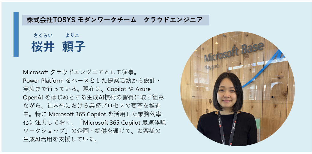 | 15:30~16:15 (45分) | MSB長野の取り組みとAI時代の新しい働き方”Copilot Studioの導入” TOSYS モダンワークチーム クラウドエンジニア 桜井 頼子 |