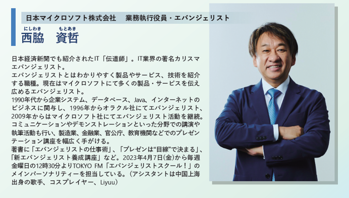 さらに、マイクロソフトのエバンジェリスト・西脇資哲氏による特別講演では AIが切り拓く未来の働き方について深掘りします。