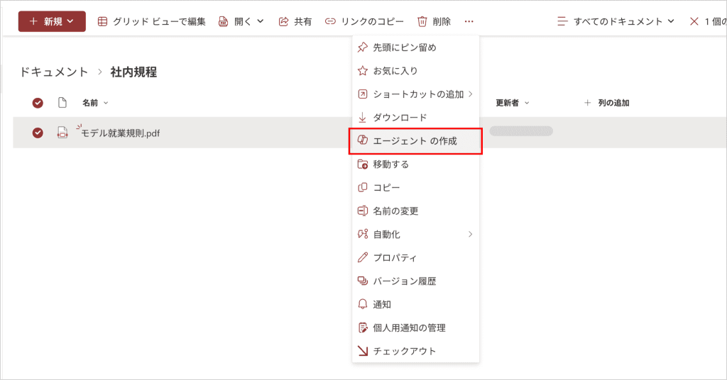 1.ナレッジとするファイルまたはフォルダを選択し、[エージェントの作成] を選択します。この操作のみでエージェントが完成します。