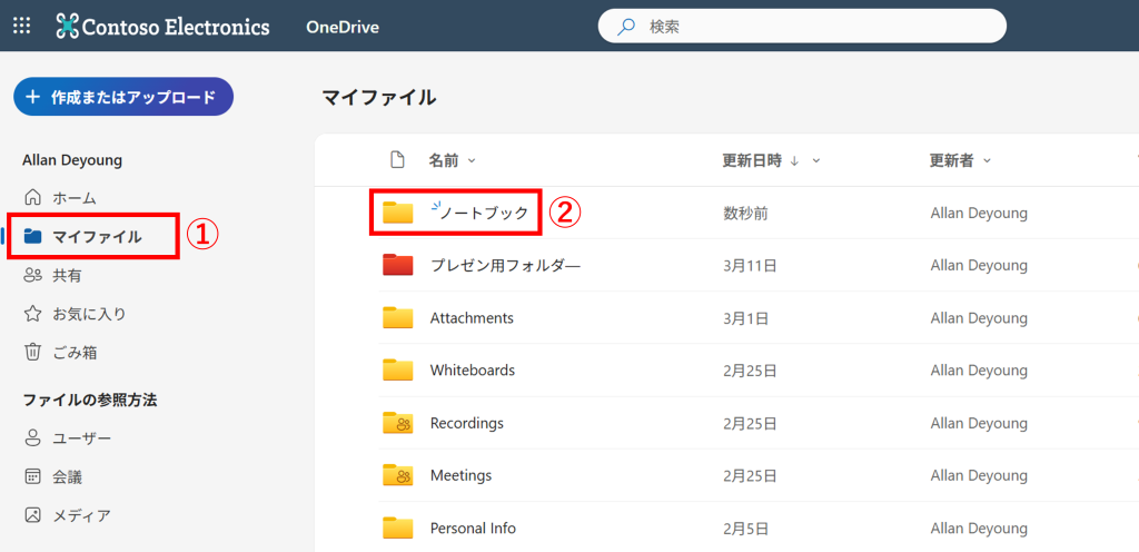 1.OneDrive を開き、①「マイファイル」>②「ノートブック」フォルダを開きます。
