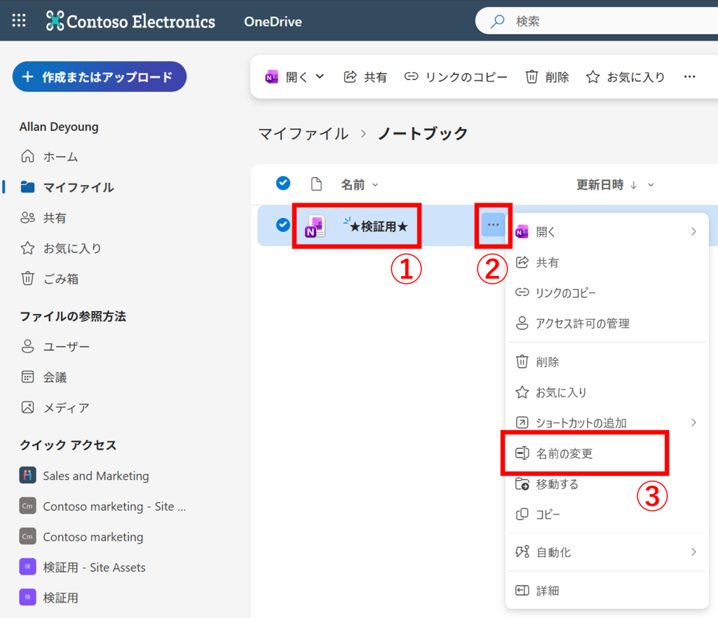2.「ノートブック」フォルダの中から変更したい①ノートブックファイルを右クリック、または②「…(その他の操作)」をクリック>③「名前の変更」を選択します。