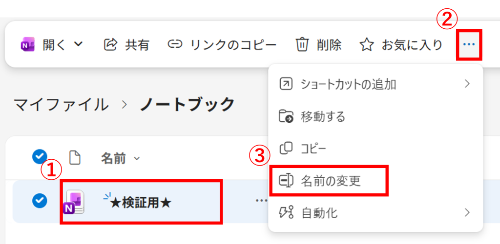 もしくは、①「ノートブック」を選択すると表示される上部水平メニュー内にある②「…」>③「名前の変更」からでも、同じ操作が可能です。