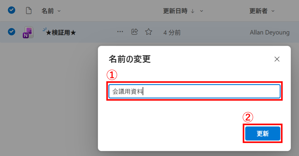 3.①の欄へ新しい名前を入力>②「更新」をクリックます。