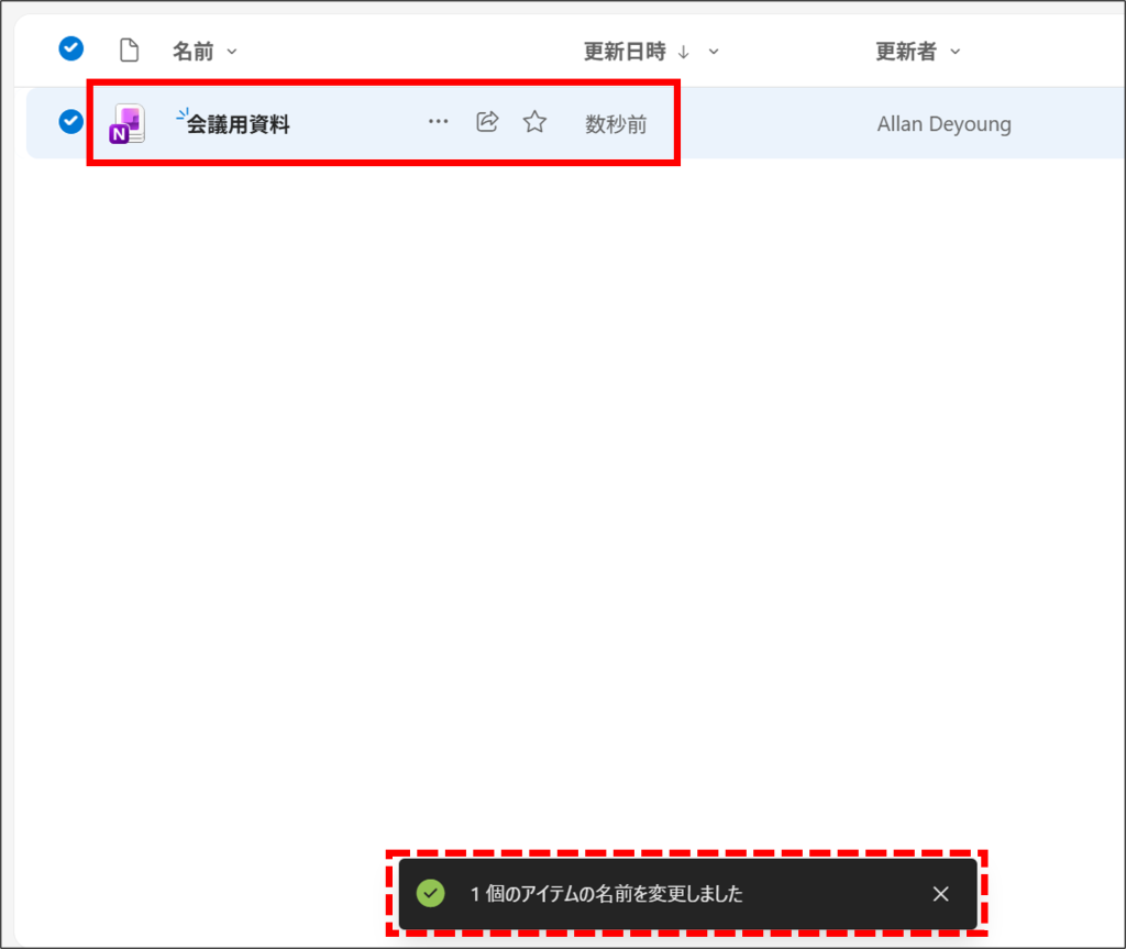 4.変更後の名前が反映されます。また、破線で示したとおり変更処理が完了した旨のメッセージが画面下部に表示されます。