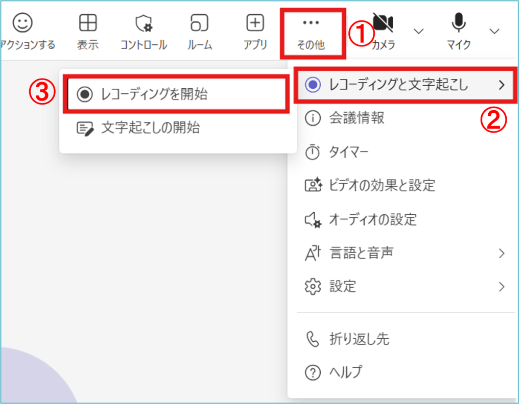 ②「レコーディングと文字起こし」を選択し、③「レコーディング開始」を選択します。