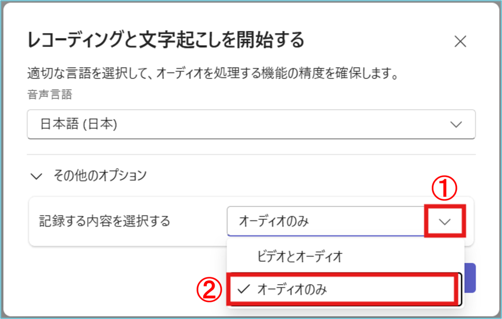 2.その他のオプション内にある、「記録する内容を選択する」の①プルダウンを選択後、②「オーディオのみ」を選択します。