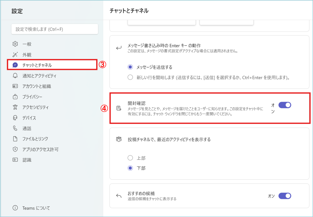 2. 設定を開いたら③「チャットとチャネル」をクリックします。