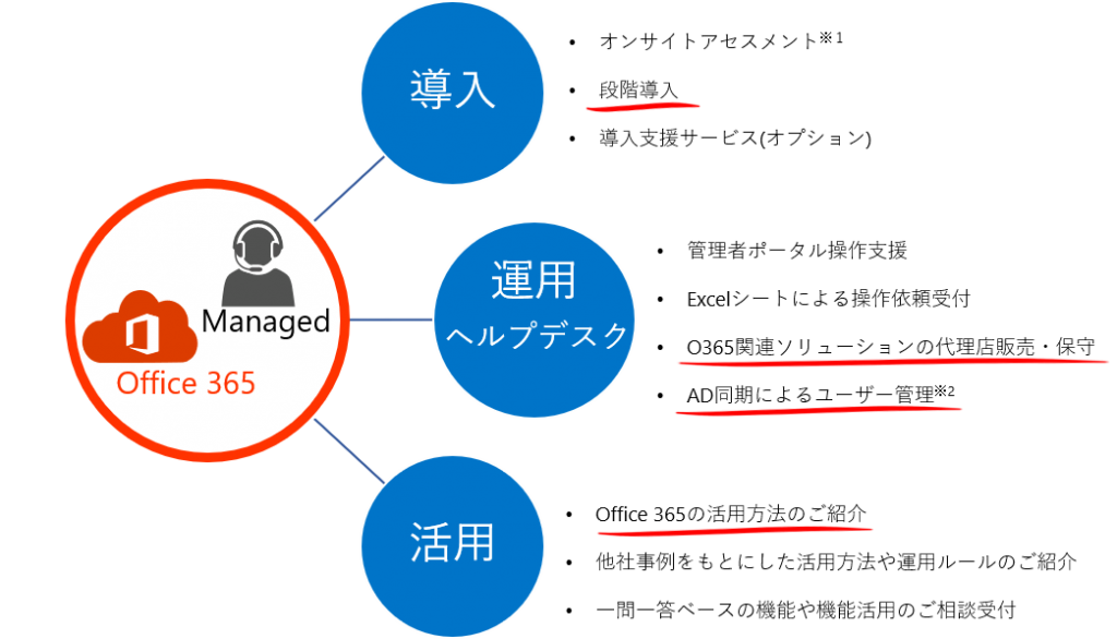 ITに関する知識を持たない方にも、Microsoft 365 の機能をフル活用して頂く為に、導入から運用をサポートさせて頂きます。