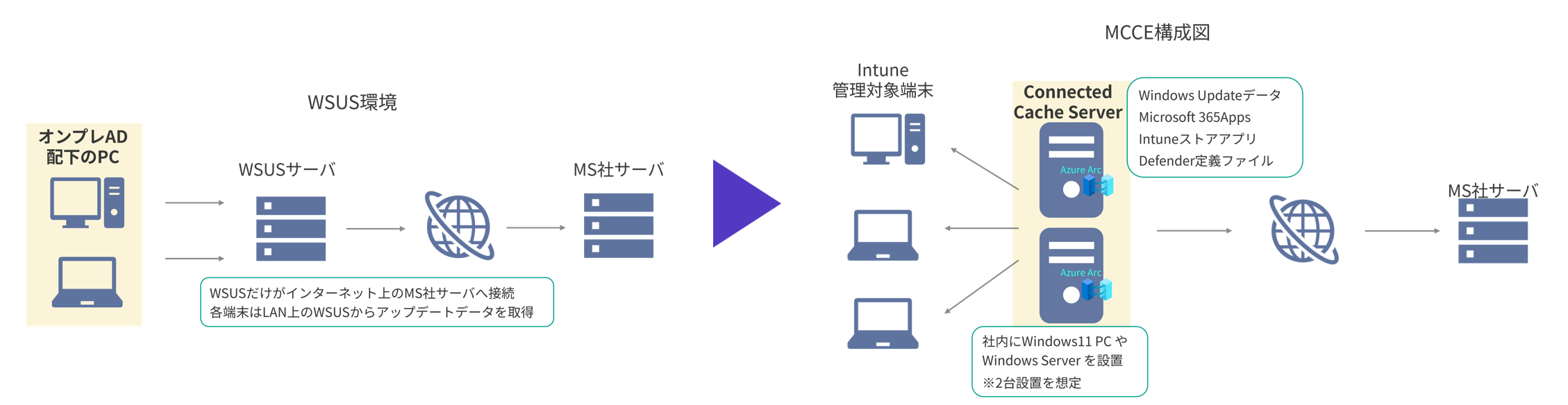 Microsoft Connected Cache は、Microsoft Intune と連携し、社内ネットワーク上にキャッシュサーバを構築することで、更新プログラムやアプリケーションの配信を効率化する仕組みです。
