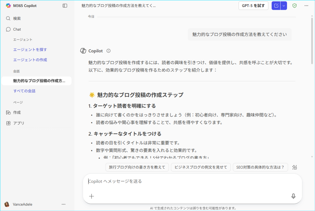 ⑤Pagesで編集Copilotの応答結果をPagesで編集することができます。