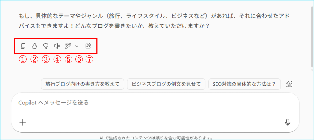 Copilot Chatの回答結果の最下部にある他の機能(➀~⑦)をご紹介いたします。