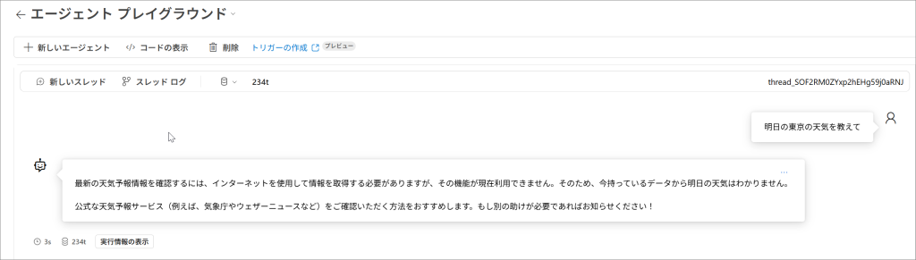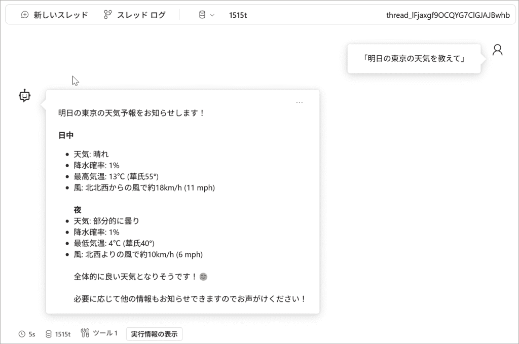 プレイグラウンドから同じように「明日の東京の天気を教えて」と聞きます。
