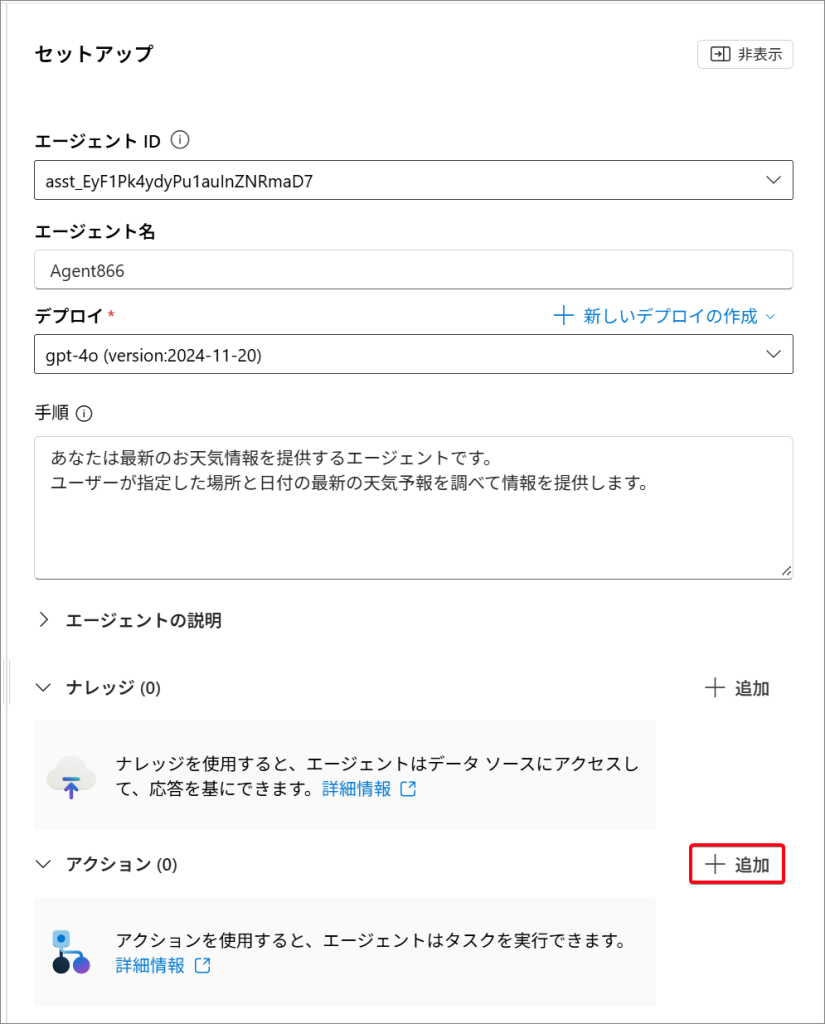 例として、最新の天気を調べてくれるエージェントを作成します。