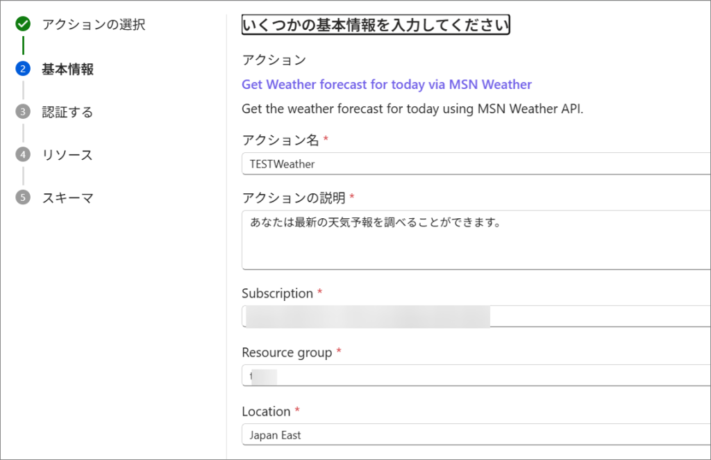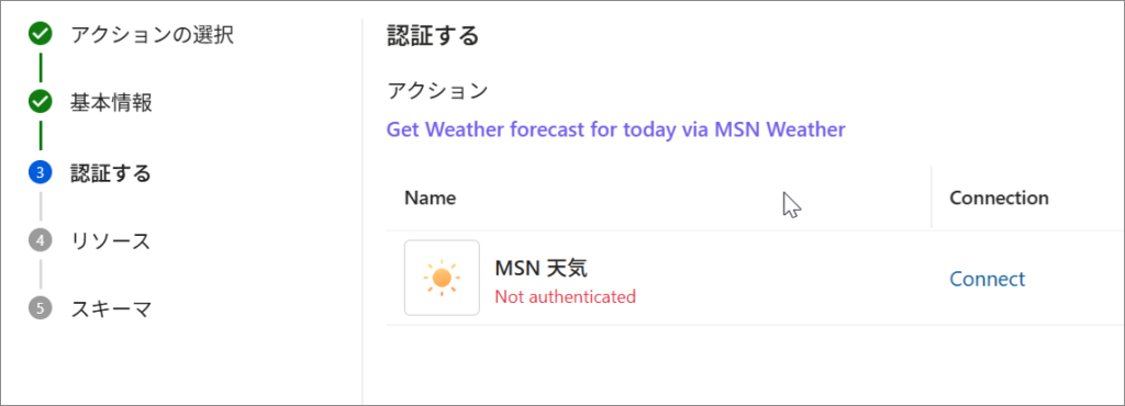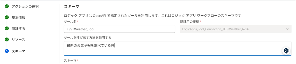 6.スキーマ情報を設定します。(本記事では「ツールを呼び出す方法を説明する」のみ記載し、その他は既定値です。)