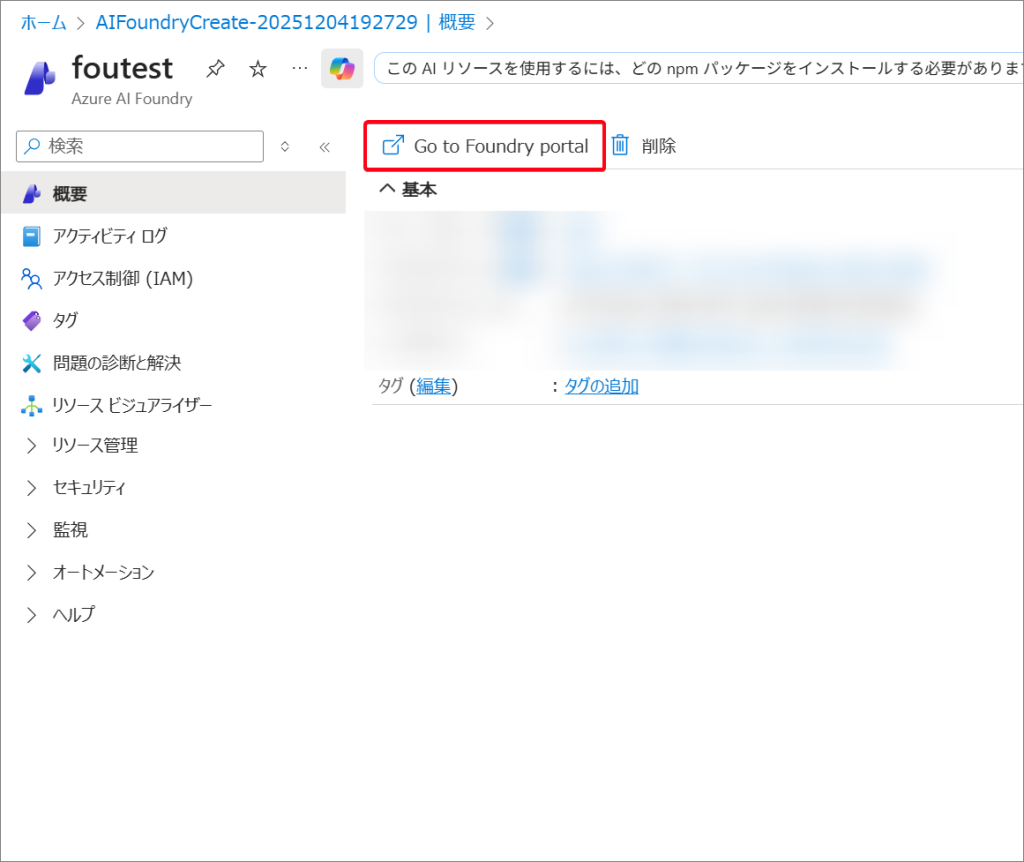 2.作成したリソースから「Go to Foundry Portal」を開きます。