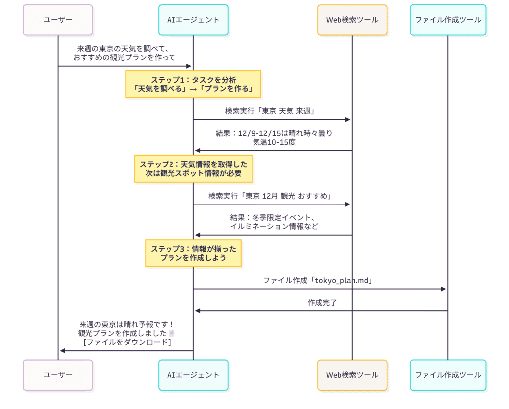 というプロセスを自動で実行してくれるのが、AI エージェントの本質です。