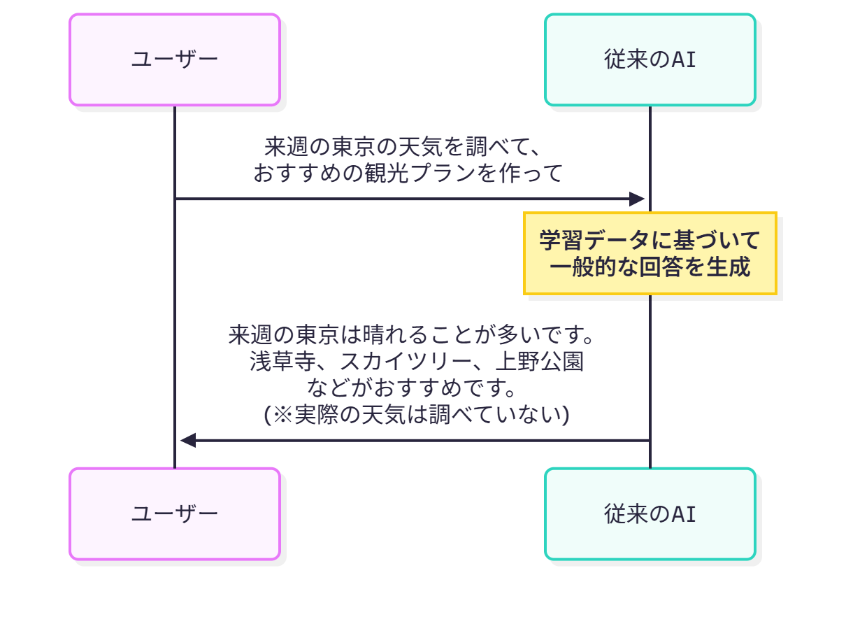 同じプロンプトを投げた際の、通常の AI と AI エージェントの動作の違いは下図の通りです。