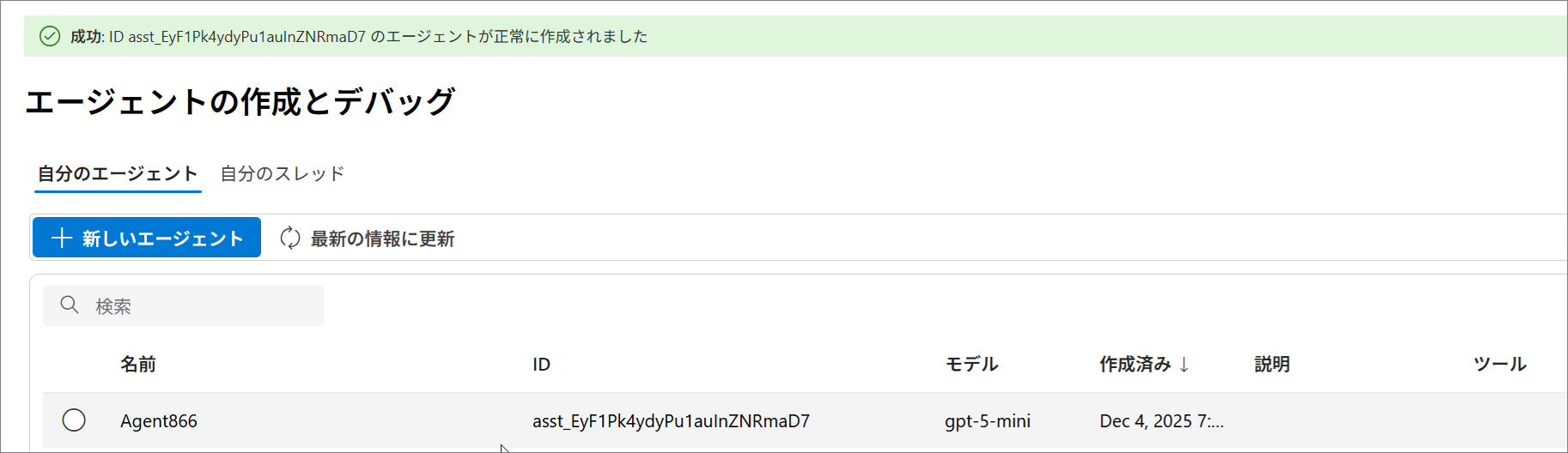 既にモデルがデプロイされている場合は、「+新しいエージェント」から新規エージェントを作成することが可能です。