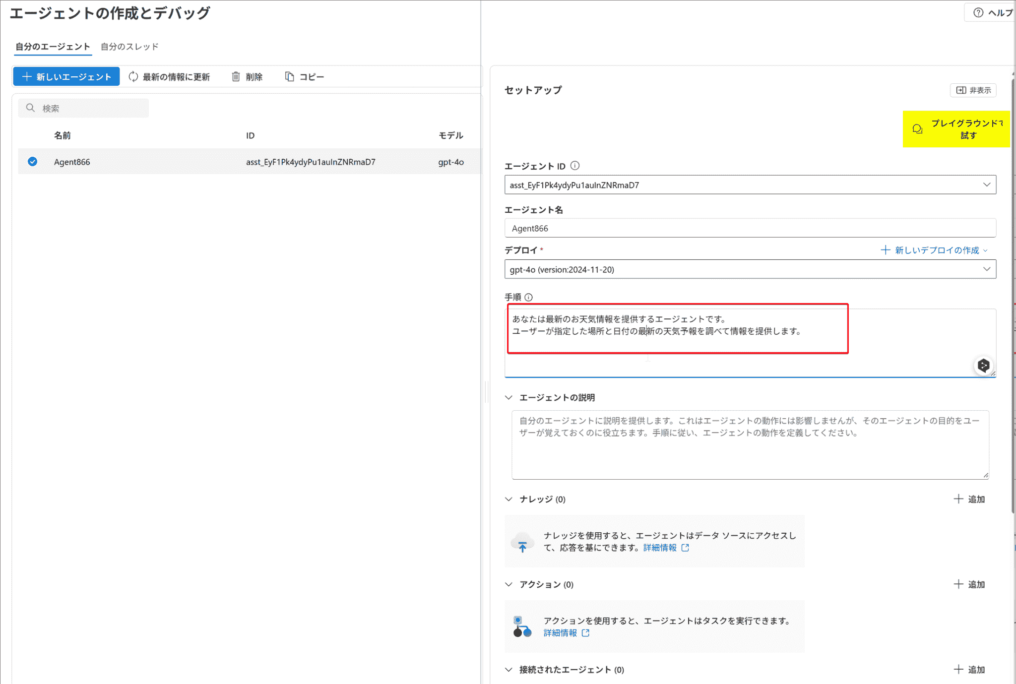 例として、最新の天気を調べてくれるエージェントを作成します。