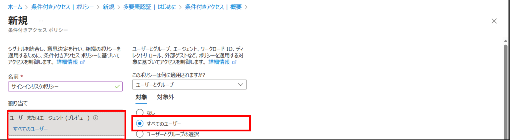 5.「ユーザーまたはエージェント (プレビュー)」から、「すべてのユーザー」を選択します。