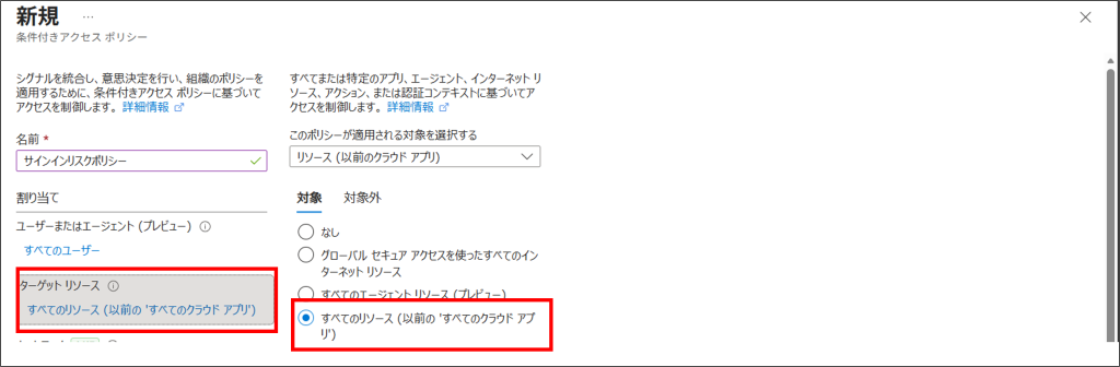 6.「ターゲットリソース」から、「すべてのリソース」を選択します。