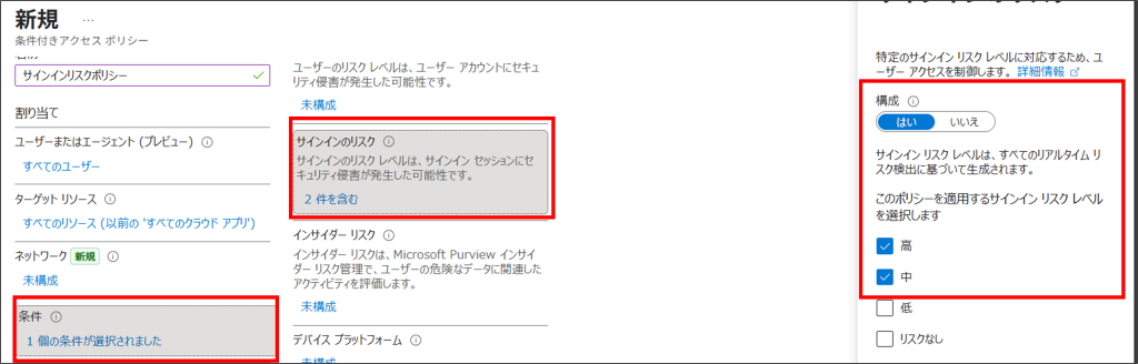 7.「条件」-「サインインのリスク」から、構成欄を「はい」に変更します。