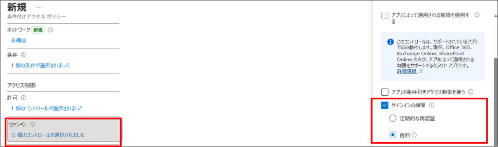 9.「アクセス制御」-「セッション」から、「サインインの頻度」、「毎回」を選択します。