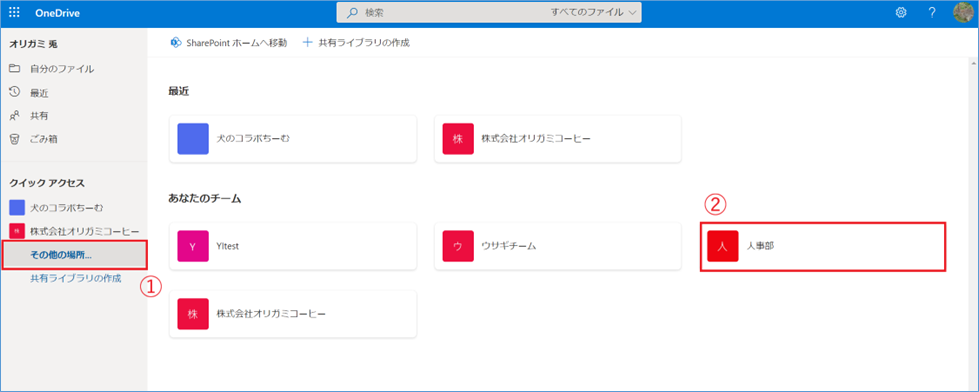 1.①「その他の場所」から②ピン留めしたいチームサイトをクリックします。