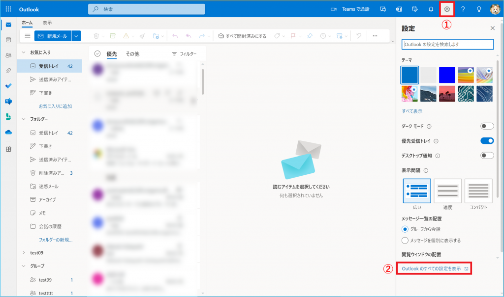 2.Outlook on the webにログインができましたら、画面上部の設定アイコンをクリックします。