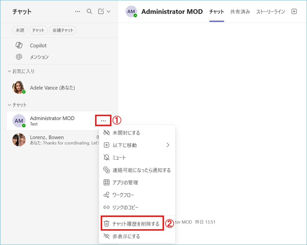 1.削除したいチャットの①「…」をクリックして、②「チャット履歴を削除する」をクリックします。