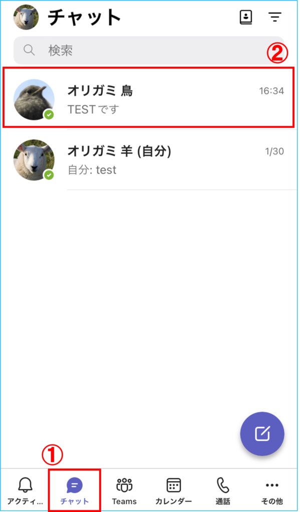1.Teamsモバイルの①チャットから②メッセージを送りたいユーザーを選択します。