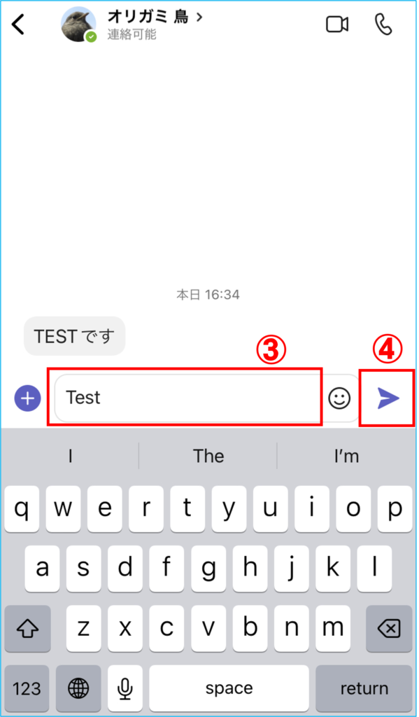 2.③送りたいメッセージを入力して、④送信アイコンを長押しします。