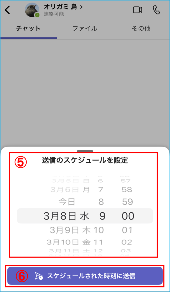 3.⑤送信したい日時を指定し、⑥「スケジュールされた時刻に送信」をタップします。