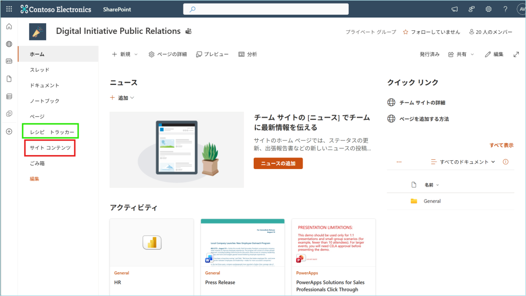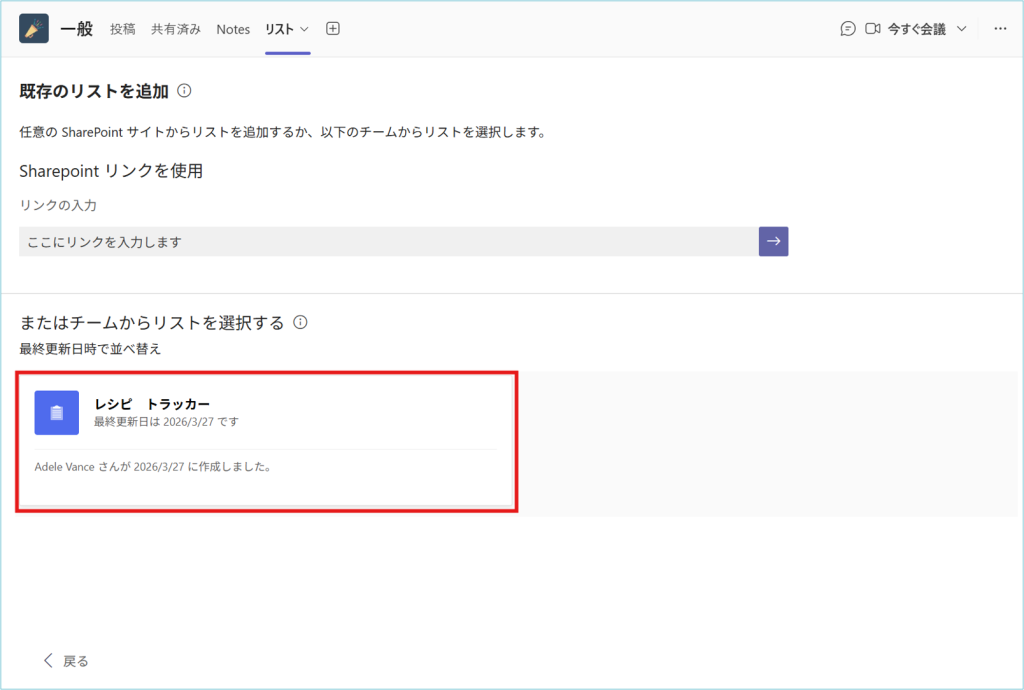 補足:チームのタブ欄に作成された、または、追加されたリストはSharePointと同期されるのでどちらからでも確認することができます。