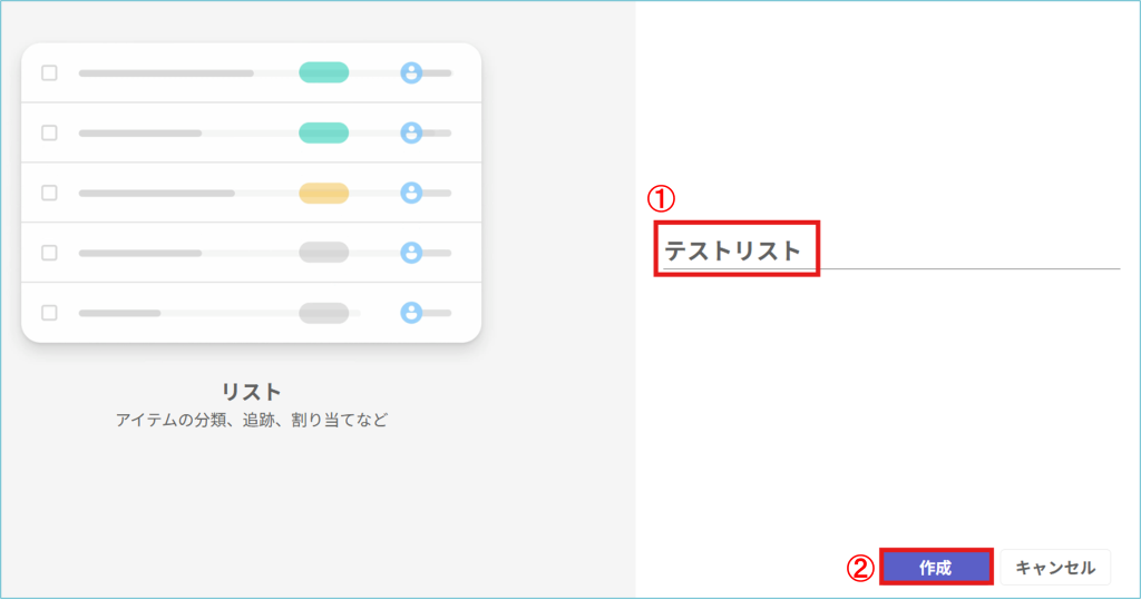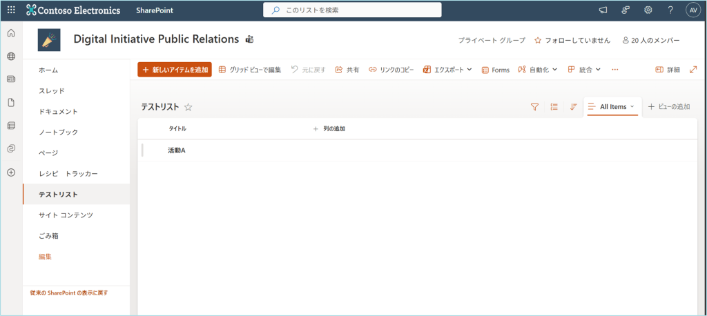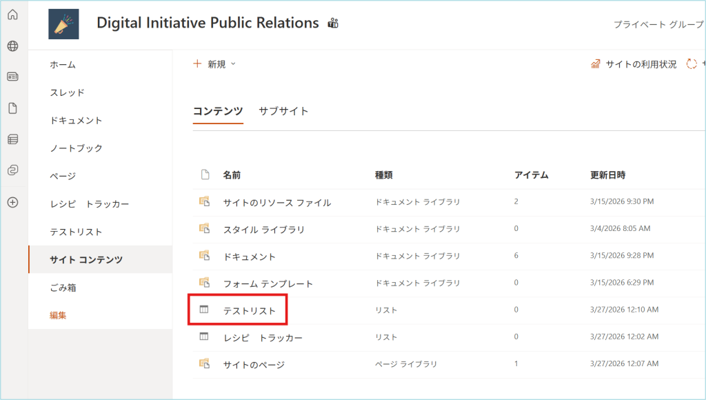 2.コンテンツの一覧が表示され「テストリスト」をクリックします。