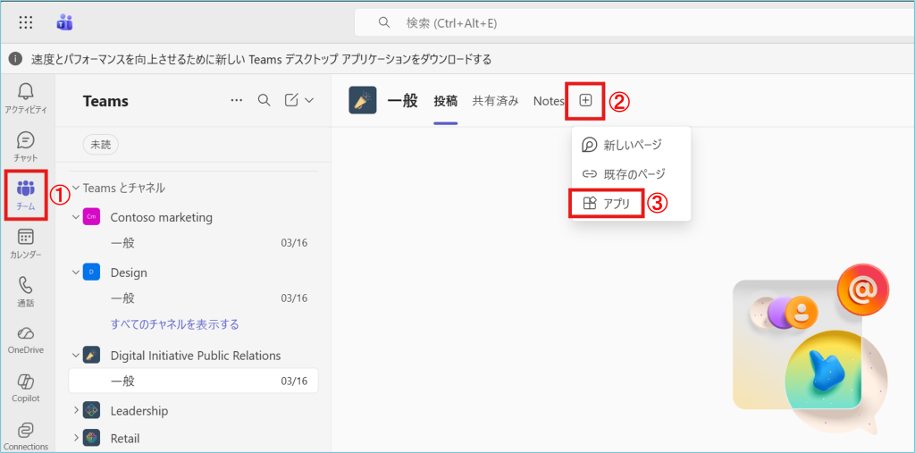 1.Teamsの①「チーム」を開き、②「+タブを追加」をクリックし、③「アプリ」を開きます。