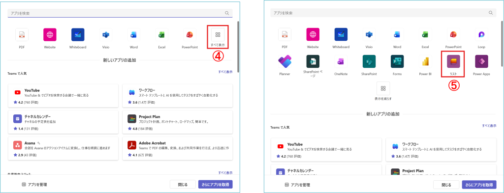 2.トップ画面より④「すべて表示」をクリックし、⑤「リスト」を選択します。