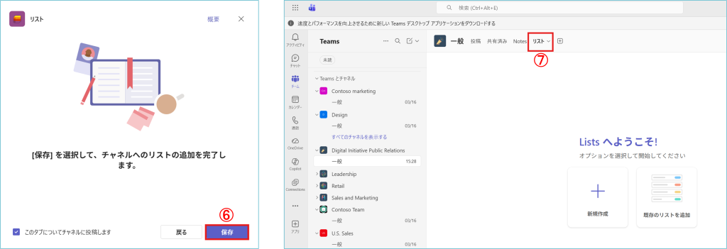 3.⑥「保存」をクリックすると、タブ欄に⑦「リスト」が入っていることを確認します。